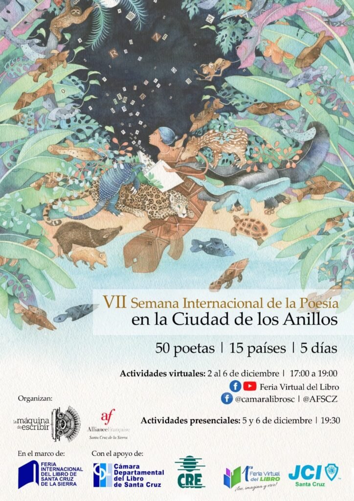 La VII Semana Internacional de la Poesía en la Ciudad de los Anillos reunirá las voces de 50 poetas de 15 países como parte de la 21 Feria Internacional del Libro de Santa Cruz. El encuentro tendrá lecturas de poesía y diálogos virtuales todos los días, del miércoles 2 al domingo 6 de diciembre, entre las 17:00 y 19:00 horas, que serán transmitidas por las páginas de Facebook: Feria Virtual del Libro, Cámara Departamental del Libro de Santa Cruz, Alianza Francesa Santa Cruz y por el canal de YouTube Feria Virtual del Libro.