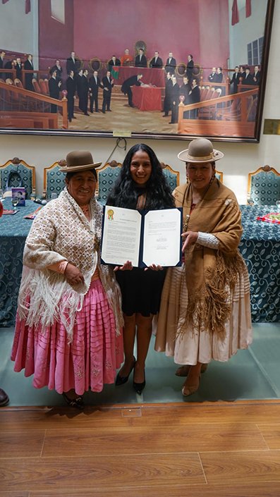 La entrega de la declaración camaral fue realizada por la Senadora Nacional y proyectista Paula Paxi de Suxo, acompañó además en este importante acto la Senadora Nacional Virginia Velasco y el director nacional de Svalorna Latinamérika, Luis Fernández.