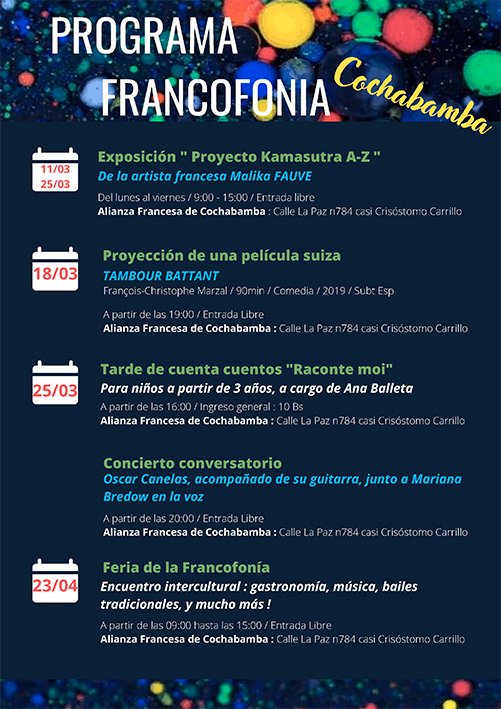 Así, la Alianza Francesa de Cochabamba retoma su agenda cultural y celebra la Francofonía con una programación que incluye un concierto conversatorio, una tarde de cuentacuentos y cine. El programa finalizará con la celebración de la tradicional Feria de la Francofonía, el 23 de abril. El propósito es nutrir el importante movimiento cultural que paso a paso se activa en Cochabamba.