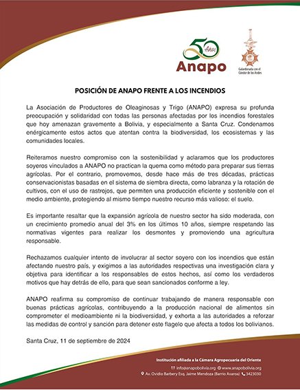 Santa Cruz, septiembre 2024. La Asociación de Productores de Oleaginosas y Trigo (Anapo) manifiesta su profunda preocupación por los devastadores incendios forestales que han afectado a más de 3 millones de hectáreas en Santa Cruz. Estos incendios están afectando gravemente la biodiversidad y las comunidades locales, lo que exige una acción inmediata y coordinada por parte de las autoridades.