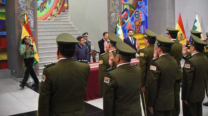 En un acto desarrollado en Casa Grande del Pueblo, Arce posesionó a Russo como nuevo comandante de la Policía y al resto de los mandos nacionales y departamentales con la mirada puesta también en una institución del Bicentenario, moderna y empática con la población.