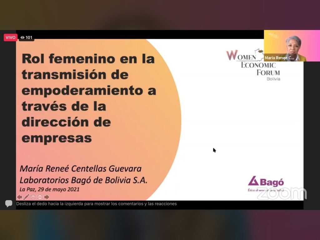 Tras algunas disertaciones ofrecidas por otras empresarias de renombre, llegó el turno de María Reneé Centellas Guevara, Gerente General de Bagó, con una presentación titulada “Rol femenino en la transmisión de empoderamiento a través de la dirección de empresas”. Centellas aseguró que el 55% del personal de Bagó está compuesto por mujeres y que ella en lo personal forma parte de diversas plataformas por el empoderamiento de la mujer, como: Women Leadership CAINCO, Business Queen de Bolivian Business, G100, Smart Women, Piensa Verde, Vesty Pakos, Comunidad B, entre otras.