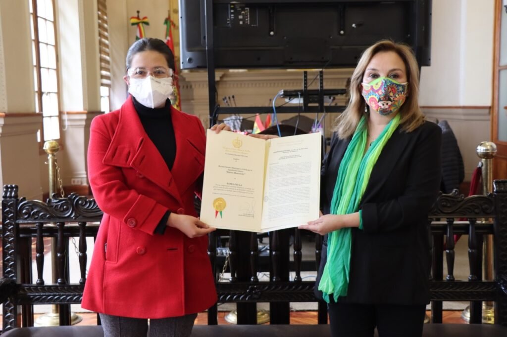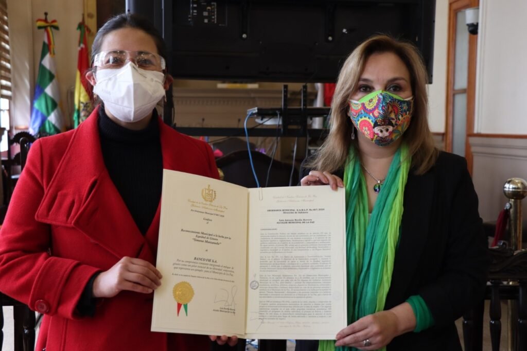 La Paz, 5 de marzo de 2021. Banco FIE recibió esta mañana el Reconocimiento Municipal a la lucha por la Equidad de Género “Simona Manzaneda” del Gobierno Autónomo Municipal de La Paz por su compromiso constante integrando el enfoque de género como pilar esencial de su identidad corporativa a través de su modelo de gestión empresarial Marca Magenta, “lo cual representa un ejemplo de esfuerzo en la lucha por la equidad de género para el Municipio de La Paz”, destaca la Ordenanza Municipal G.A.M.L.P. No. 067/2020, que otorga este galardón.