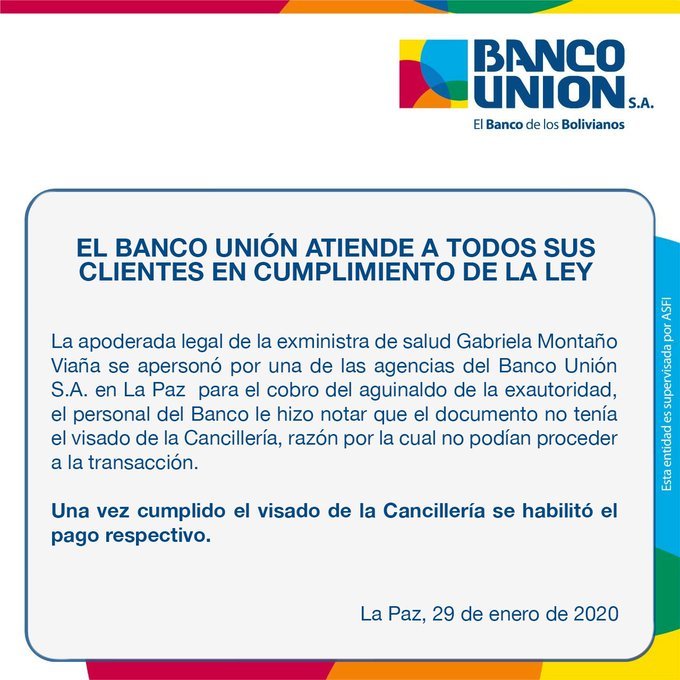 El Banco Unión, a través de un comunicado en sus redes sociales, aclaró que la apoderada legal de la exministra de Salud, Gabriela Montaño, retiró el aguinaldo de su cuenta bancaria tras resolver una observación relativa al visado de Cancillería en el poder notarial.