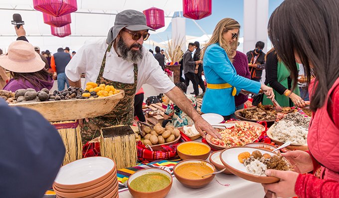 Posteriormente, los asistentes pudieron compartir un tradicional apthapi a cargo del reconocido chef Marco Bonifaz y el equipo de Manq’a Restaurante, amenizado con la música exclusiva preparada por la cochabambina DJ SúperCholita, Ariadna Soto, quien se caracteriza por usar una llamativa máscara y una pollera nortepotosina.