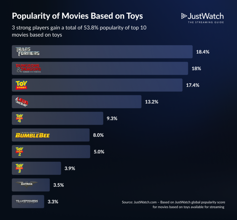 Recopilaron una lista de las 10 mejores películas basadas en juguetes y compararon la popularidad de estas producciones y descubrieron que el líder indiscutible es la franquicia Toy Story. Cuatro películas de la serie entraron en la lista, recogiendo un total del 35,6%. Su competidor más cercano resultó ser la franquicia Transformers, con «Transformers» ocupando el primer lugar, seguido de «Bumblebee» en sexto lugar y «Transformers: The Last Knight» en último lugar.