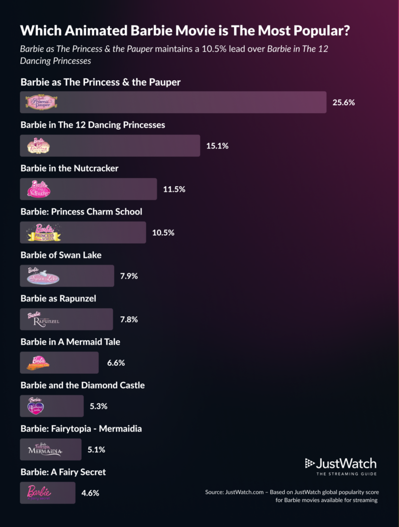 El siguiente gráfico contiene las 10 mejores películas de Barbie, con la primera película de Barbie: «Barbie en el Cascanueces» ocupando el tercer lugar y superando a «Barbie: Princess Charm School» por solo un 1%. “Barbie del Lago de los Cisnes” y “Barbie como Rapunzel” se enfrentan, aterrizando en el quinto y sexto lugar con una diferencia de solo 0.1%