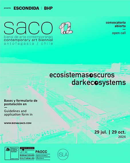 La convocatoria de la Bienal de Arte Contemporáneo SACO1.2 Ecosistemas oscuros, presentada por Escondida | BHP, ya se encuentra abierta y recibirá hasta el 29 de octubre de 2024 propuestas de artistas de todo el mundo que quieran ser parte de la exposición que será desplegada en el Muelle Histórico Melbourne Clark de Antofagasta, Chile.
