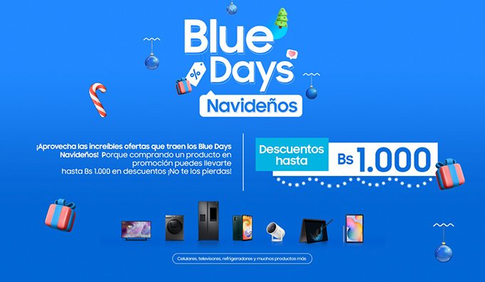 Diciembre 2022. Una campaña exitosa y muy bien aceptada por la población boliviana, tiene que repetirse y volverse una estación, por ello, Samsung lanza nuevamente los “Blue Days Navideños”, días de descuento con premios inmediatos para los productos Samsung en promoción. La temporada se inició el viernes 9 de diciembre de 2022 y se extiende hasta el 7 de enero de 2023 o hasta agotar stock.