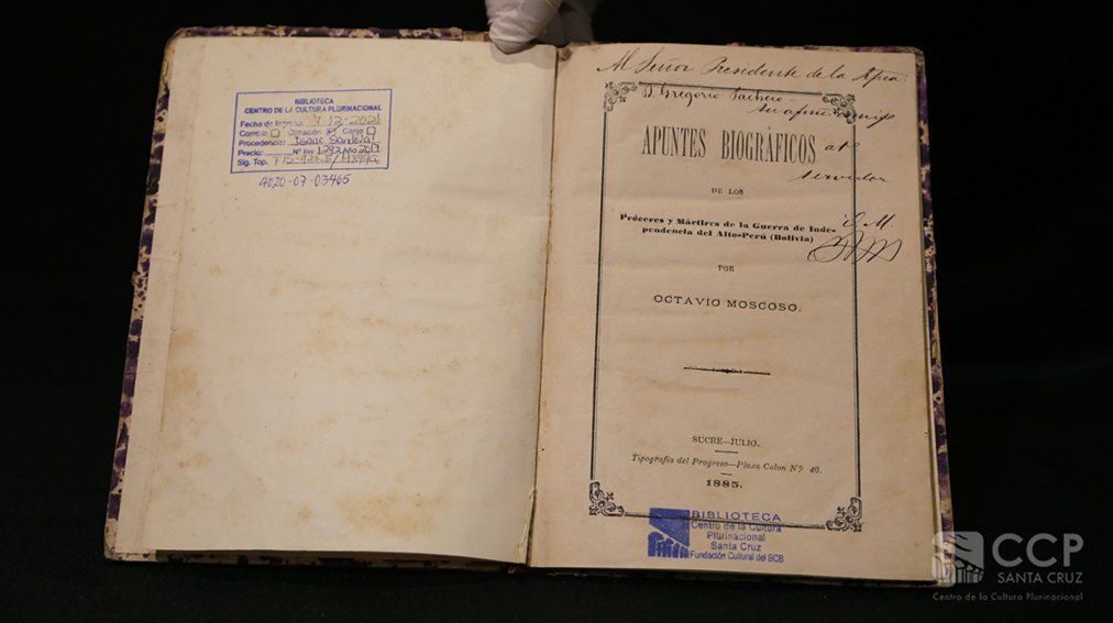 El siguiente documento pertenece al Centro de la Cultura Plurinacional y lleva por título Apuntes Biográficos de los Próceres y Mártires de la Guerra de Independencia del Alto- Perú (Bolivia). Este singular libro de biografías fue publicado en 1885 por Octavio M.Moscoso y es uno de los primeros esfuerzos en recuperar, organizar y difundir las biografías de figuras que participaron en la gesta independentista del Alto Perú.