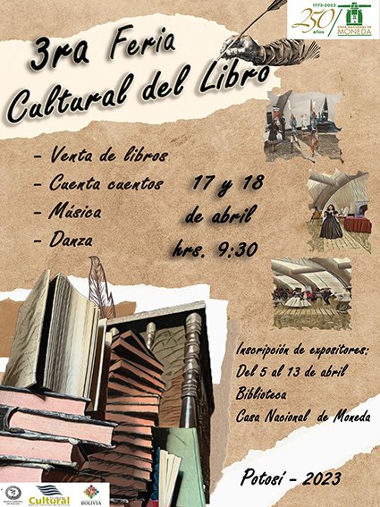 La Casa Nacional de Moneda, dependiente de la Fundación Cultural del Banco Central de Bolivia, invita a todas las editoriales, escritores independientes, artistas y gestores culturales a inscribirse para participar de la tercera Feria del Libro que se celebrará en los ambientes del repositorio este 17 y 18 de abril.