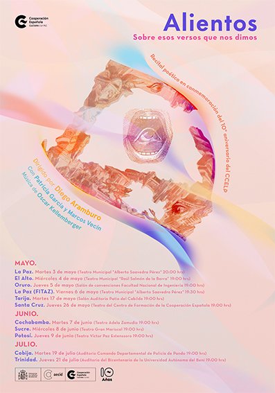 Sin lugar a dudas una de las mayores apuestas a la creación que llega entre las actividades, es un espectáculo de poesía organizado por las manos del dramaturgo Diego Aramburo. «Alientos. Sobre esos versos que nos dimos», es el título de la obra que se conforma con una selección de poemas escritos, en este siglo, por creadoras y creadores españoles y bolivianos. La intención de la selección es generar un todo con un sentido de encuentro cálido, sensual y sensible, como lo es el español, la lengua que une a Bolivia y España.