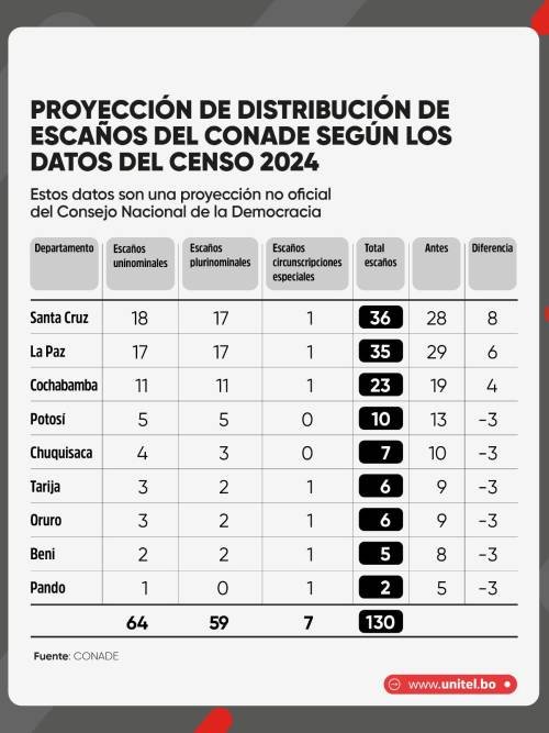 En tanto, Chuquisaca bajaría de 10 a 9 escaños; Tarija se quedaría con 9 escaños, y Oruro tendría 9; finalmente Beni y Pando se mantendría con 8 y 5 escaños respectivamente.