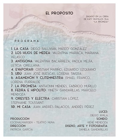 La obra fue escrita por Katy Bustillos, que al igual que Lautaro Ruiz y otros creadores fue invitada por el Taller para hacer la dramaturgia de una pieza, que tituló como «La promesa», que fue el punto de partida para «El propósito».