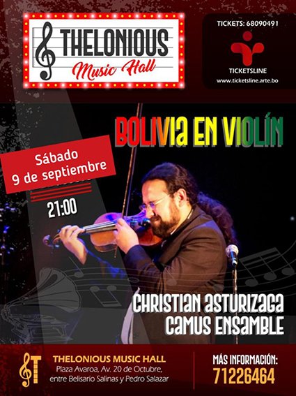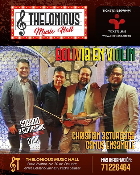 Vive una noche inolvidable en el Thelonious Music Hall. «Bolivia en Violín» promete llevar a los asistentes en un viaje musical único y recordarles por qué nuestra música es admirada no sólo en nuestro país si no también en todas partes del mundo.