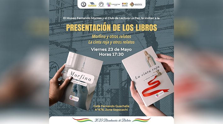 El Club de Lectura La Paz se complace en invitar a la comunidad a la presentación oficial de sus nuevas colecciones de cuentos: Morfina y otros relatos y La cinta roja y otros relatos, que reúnen más de 30 obras originales de autores que forman parte de la organización. Este significativo evento literario se llevará a cabo el jueves 23 de mayo de 2025, a las 17:30 en el emblemático Museo Fernando Montes (MFM) dependiente de la Fundación Cultural del Banco Central de Bolivia (FC-BCB), ubicado en la zona de Sopocachi, calle Fernando Guachalla.