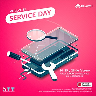 Este jueves 24, el viernes 25 y sábado 26 de febrero, Huawei celebra su “Service Day”. Durante estos tres días los usuarios Huawei de la ciudad de La Paz, Cochabamba y Santa Cruz podrán reparar sus dispositivos en los centros oficiales de atención al cliente Huawei pagando únicamente el costo de los repuestos, es decir, que el costo de mano de obra es cortesía de la marca.