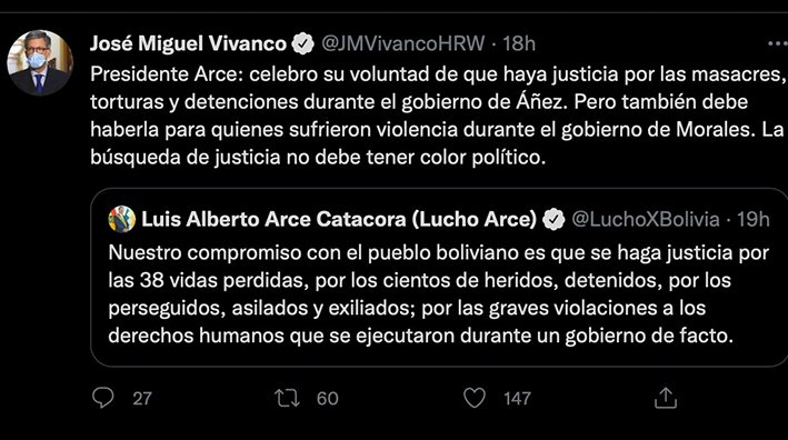Asimismo, el director ejecutivo de Derechos Humanos, José Miguel Vivanco, respondió en la plataforma de Twitter una publicación del mandatario boliviano, respecto a las víctimas de Senkata, afirmando que también debería haber justicia por las personas que “sufrieron violencia durante el Gobierno de Morales” y finalizó: “La búsqueda de justicia no debe tener color político”.