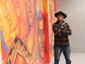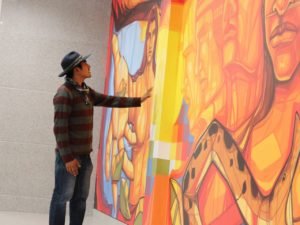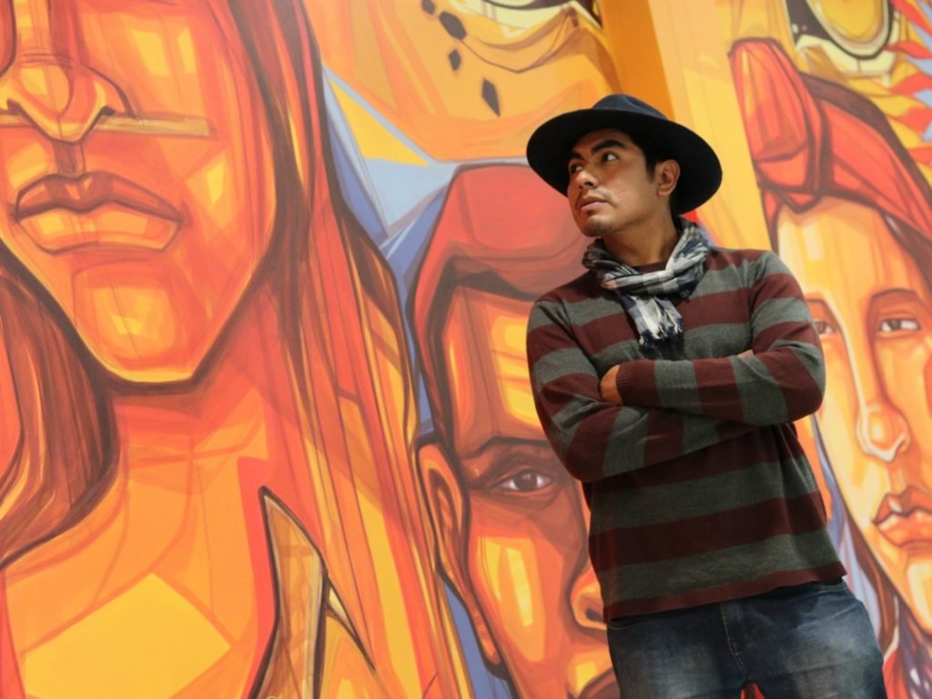«Ha sido un trabajo loco el pensar en qué hacer. Son 36 naciones que debía sintetizar en un muro de 11 metros. No es un trabajo fácil considerando la diversidad que tenemos», contó Guillermo Tejerina, artista plástico y muralista que pintó la obra «Identidades Regionales» que se exhibe en el tercer piso de la Casa Grande del Pueblo.