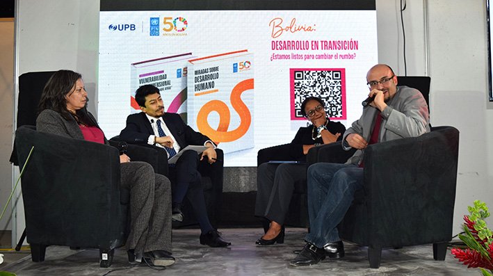 Como parte de la conmemoración por sus 50 años en Bolivia, el Programa de las Naciones Unidas para el Desarrollo (PNUD), en alianza con la Universidad Privada de Bolivia (UPB), organizó el conversatorio “Bolivia: Desarrollo en transición ¿estamos listos para cambiar el rumbo?”, que se realizó en la Feria Internacional del Libro de La Paz.