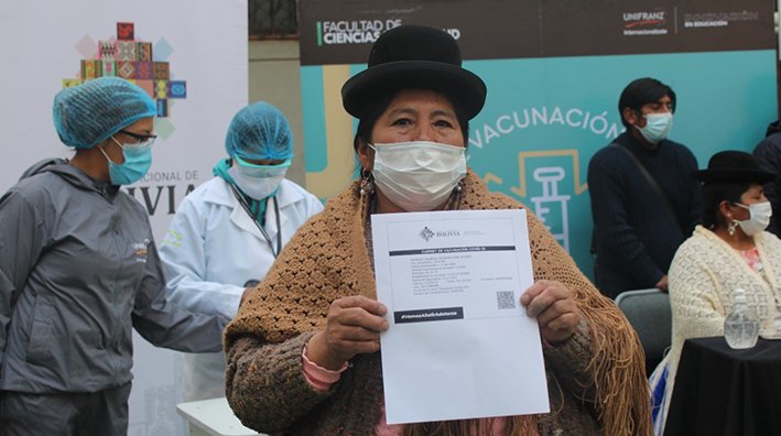 “Como institución, nuestro trabajo apunta a fortalecer la campaña nacional de vacunación ‘Una dosis de esperanza’ en beneficio de la población en general. Nos sumamos a la campaña con el espíritu de nuestro lema institucional: Este Virus Lo Paramos Unidos», manifestó Milena Arroyo, responsable del Centro de Vacunación UNIFRANZ El Alto.