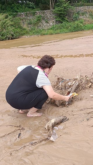 Una instalación de tejido de elementos reciclados del río es la propuesta de Nadia Callaú, quien recorrió sus orillas recogiendo diferentes elementos para mostrar tanto las historias que se tejen en este espacio, como llamando la atención sobre la contaminación.