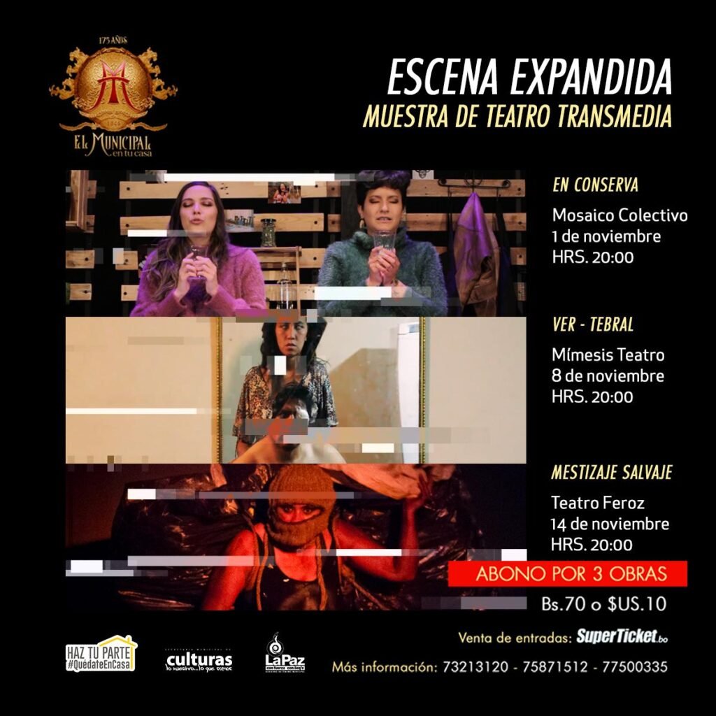 La pieza es parte de la iniciativa Escena Expandida: Muestra de teatro transmedia, que difundirá dos obras más en noviembre: “Ver-Tebral” y “Mestizaje salvaje”. El abono por las tres presentaciones es de Bs 70. Las entradas están disponibles en www.superticket.bo.