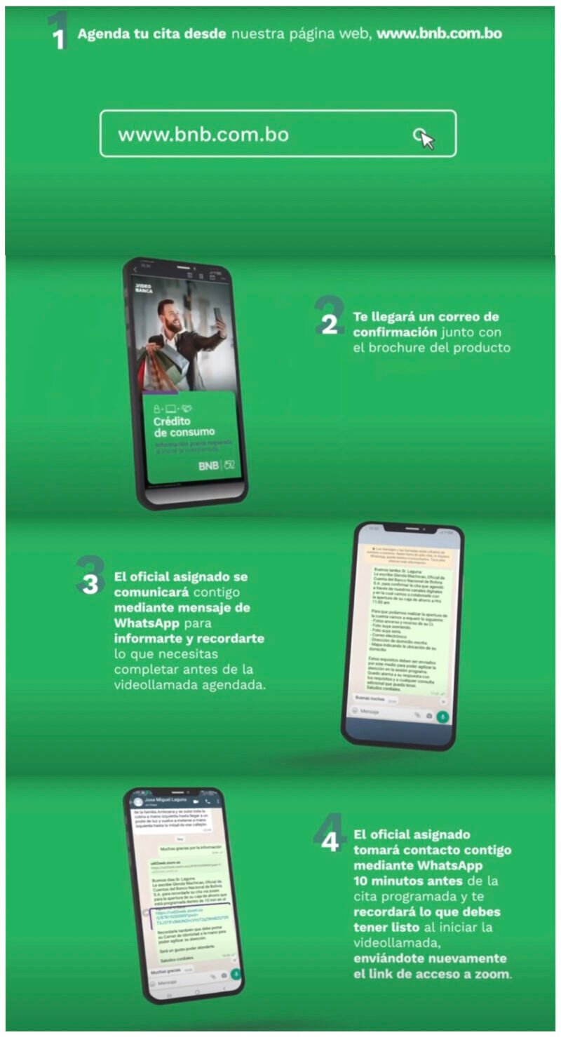 Abrir una caja de ahorro, solicitar una tarjeta de crédito, acceder a un crédito de consumo, entre otros servicios ahora son posibles en poco tiempo, mediante una conexión vía Zoom entre el usuario y un agente del Banco Nacional de Bolivia. Se trata del nuevo canal de atención Video Banca del BNB que ya está disponible a tan solo cuatro sencillos pasos. Alejandro Calbimonte, Vicepresidente de Operaciones del BNB, explica el procedimiento.