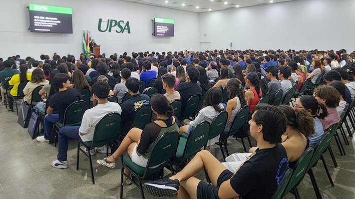 “En esta conferencia, queremos reafirmar ese sentimiento tan importante que nos une a Santa Cruz, particularmente en el caso de nuestra Universidad, creada hace 40 años por visionarios cruceños, con una identidad y un sentido totalmente orientado a esta región, al servicio del desarrollo y del progreso de nuestra tierra”, comentó en la apertura, la Rectora de la UPSA, Lauren Müller de Pacheco, dirigiéndose al auditorio compuesto por estudiantes de primer semestre, decanos, docentes e invitados especiales.