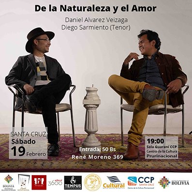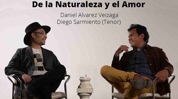 Los artistas Daniel Alvarez Veizaga (piano) y Diego Sarmiento (tenor) presentan el Concierto “De la Naturaleza y el Amor” donde se interpretarán obras para piano y el estreno de Cinco Canciones Quechuas: Intillay, Qanmikanki, Aqurakichu, …nispa… y Para. Las canciones están reunidas bajo el título “Historias Quechuas de la Naturaleza y el Amor” inspiradas en poesías anónimas pre-colombinas.