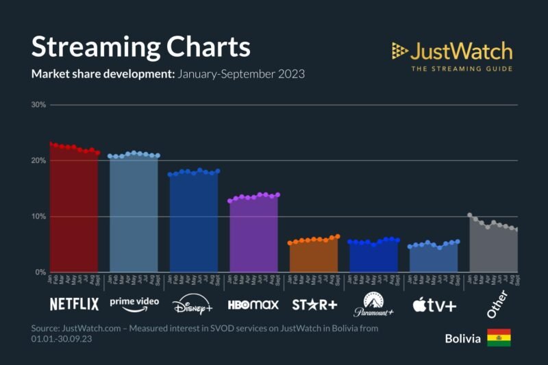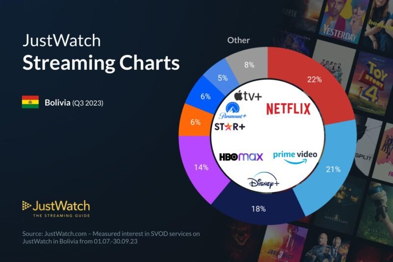 La plataforma JustWatch publicó los datos más recientes sobre las cuotas de mercado de los servicios de streaming para el tercer trimestre de 2023 en Bolivia.