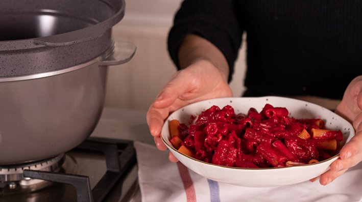 Agregamos agua en la Cacerola y hervimos a fuego mínimo. Colocamos el Vaporizador y las remolachas. Cocinamos aproximadamente 15’.