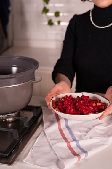Agregamos la pasta y continuamos la cocción. Una vez que las remolachas estén cocidas y la pasta lista retiramos del fuego.