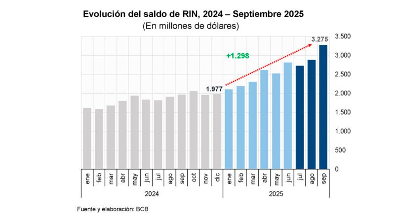 Al respecto, al 30 de septiembre, las RIN alcanzaron un saldo de $us3.275 millones lo que representa un incremento de $us1.298 millones con relación a diciembre de 2024, resultado que confirma no solo la estabilidad de las reservas, sino el desempeño significativamente positivo en lo que va de la presente gestión.