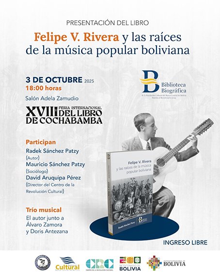 En el marco de acciones de difusión de la Biblioteca Biográfica de la FC-BCB Rumbo al Bicentenario de Bolivia 2025, que actualmente cuenta con una colección de 25 obras que rinde homenaje a mujeres y hombres que han aportado significativamente a las artes y culturas en Bolivia, el CRC tiene el agrado de presentar el libro Felipe V. Rivera y las raíces de la música popular boliviana del autor Radek Sánchez Patzy.