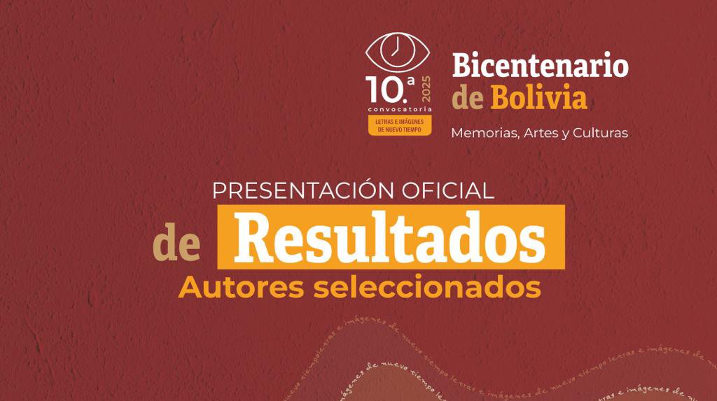 30 de septiembre de 2025. Luego de un proceso exhaustivo y transparente de evaluación de las obras, el Centro de la Revolución Cultural (CRC), dependiente de la Fundación Cultural del Banco Central de Bolivia (FC-BCB), con enorme agrado, informa a la población que ya tiene los resultados oficiales de la 10.ª Convocatoria Letras e Imágenes de Nuevo Tiempo: “Bicentenario de Bolivia. Memorias, artes y culturas”.
