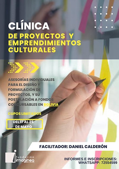 Asimismo, la clínica de proyectos y emprendimientos culturales incluye asesorías individuales para el diseño y formulación de proyectos y su postulación a fondos concursables en Bolivia.