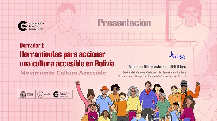 El Movimiento Cultura Accesible da un paso más hacia una cultura inclusiva en Bolivia con la presentación de tres nuevos materiales que conforman un conjunto de herramientas que impulsan una cultura más accesible en el país. Los materiales conformados por un diagnóstico, un glosario y un epílogo se presentarán el viernes 18 de octubre a las 10:00 en el Centro Cultural de España en La Paz (CCELP) en un acto abierto al público y que contará con la presencia del Embajador de España, Fernando García Casas, y miembros del Movimiento Cultura Accesible.