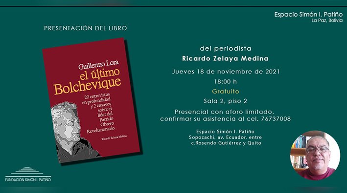 El jueves 18 de noviembre, a las 18:00, en la Sala 2 piso 2 del Espacio Simón I. Patiño, se realizará la presentación del libro «Guillermo Lora, el último Bolchevique», del periodista Ricardo Zelaya Medina, organizado junto al Centro de Estudios para el Desarrollo Laboral y Agrario (CEDLA).
