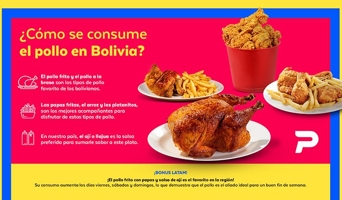 El unicornio líder en tecnología también reveló que, en el caso de Bolivia, el pollo se prefiere frito, a la brasa, y a la leña. Sin embargo, el plato no viene solo, sino que está acompañado por papas, arroz y platanitos.