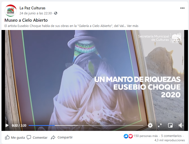 Sólo en la página La Paz Culturas, el jueves 24, la actividad más vista fue la Galería a Cielo Abierto con el artista Eusebio Choque en el Valle de la Luna. 11.532 personas siguieron la producción audiovisual en la que el pintor habló sobre su producción, las temáticas en las que se enfoca y las técnicas que emplea al momento de crear.
