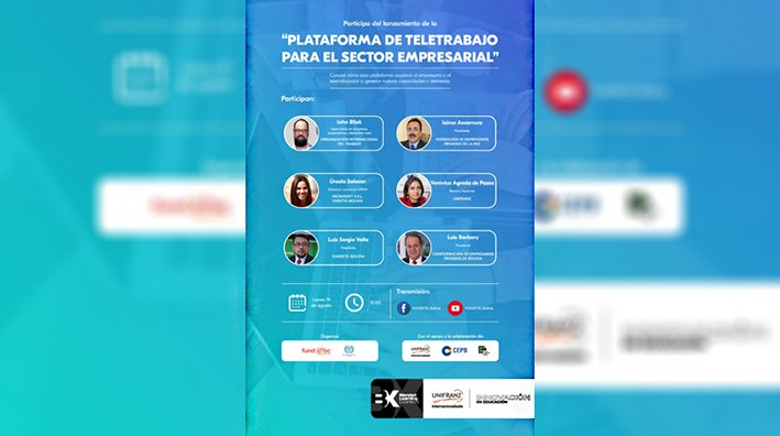 La Fundación para el Desarrollo de las Tecnologías de Información y Comunicación – Fundetic-Bolivia, conjuntamente con la Organización Internacional del Trabajo – OIT y el apoyo de la Confederación de Empresarios Privados de Bolivia – CEPB, la Federación de Empresarios Privados de La Paz – FEPLP, la empresa tecnológica Microsoft y la Universidad Privada Franz Tamayo – Unifranz presentaron de manera oficial la plataforma de teletrabajo denominada: “e-teletrabajo”.
