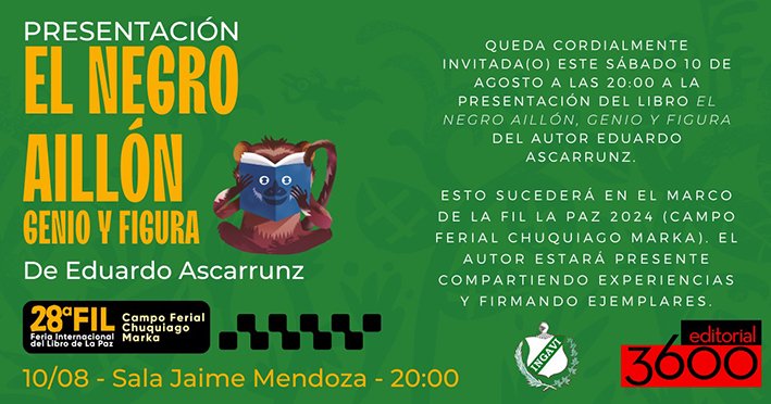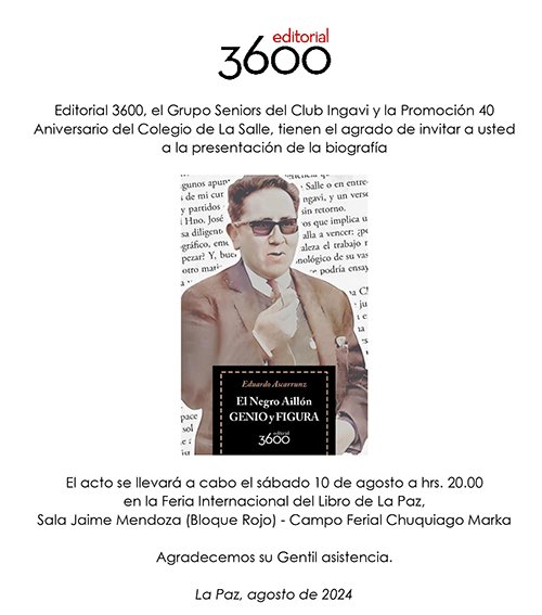 El Grupo Seniors del club Ingavi y la Promoción 40 Aniversario del Colegio de la Salle —patrocinadores de la publicación—, vienen convocando a los miles de exalumnos lasallistas e hinchas del imbatible Ingavi al lanzamiento de «El Negro Aillón, genio y figura». El libro está en el stand de Editorial 3600, en la Feria del Libro de La Paz, entre el 31 de julio y el 11 de agosto, en el Campo Ferial Chuquiago Marka.