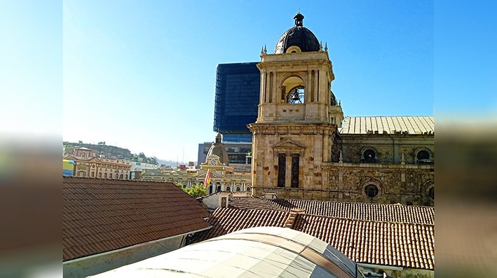 Desde el puente hay una suerte de marco arquitectónico en el que se ve las diferencias constructivas de forma cronológica en La Paz: justo al frente está la catedral metropolitana, que data del siglo XIX; también se ve el edificio del Banco Central de Bolivia (BCB), que data del siglo XX, y finalmente, la Casa grande del Pueblo, una estructura moderna que es del siglo XXI.