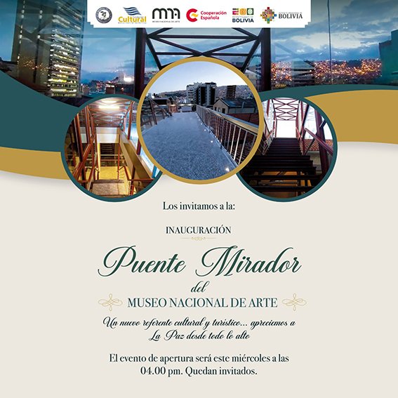 “Quienes ingresen al Museo no sólo podrán ver las exposiciones de arte, también gozarán de esta vista privilegiada de la ciudad, visita que podrá ser acompañada por un guiaje”, explicó Claribel Arandia Tórrez, directora del MNA, dependiente de la Fundación Cultural del Banco Central de Bolivia (FCBCB).