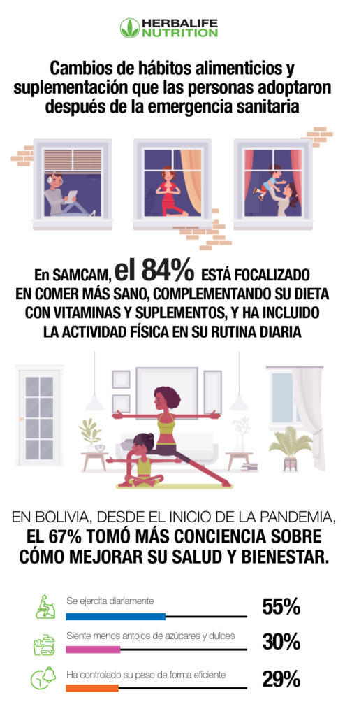 La Paz, septiembre 2021. Los resultados del estudio realizado en Centro y Sudamérica por Herbalife Nutrition, a través de OnePoll, revelaron que el 84% de los encuestados manifestaron que tomaron medidas para mejorar su salud en los últimos meses, después de lo vivido durante la emergencia sanitaria.