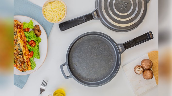 La Essen Flip se puede usar de ambos lados simplemente girándola con el mango sobre la cocina, es desmontable y es posible utilizarla de forma separada como dos sartenes individuales. Sus paredes de gran espesor, junto con la elevada conductividad del aluminio, permiten una óptima distribución del calor, logrando rápidamente una temperatura homogénea en todo el cuerpo y cocciones rápidas y exitosas.