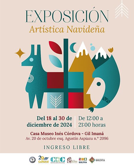 Exposición Artística Navideña: Liliana Laura Quisbert, Jorge Altamirano, Bryan Bernardo Sayco Mejía, Winy Yarichimo Pariamo, Carlos Cordero Montiel, Gonzalo Barco Flores, Andrea Rodríguez Villarreal, Fabiola Gutiérrez, Anticuchera (Esperanza Eyzaguirre), Ximena Patiño, Nelson Saico Alarcón, Karla Wara Callisaya Ramos, Carla Ximena Echeverría Cruz, Cristina Cruz Paredes, Donato Fernández Moreno, Rocío Chuquimia, Sigrid Álvarez, Inti Huáscar, Agar Sarai Oquendo, Vania Gabriela Laura Montecinos, Nadia Rolque Quiroz, Wendy Sofía Arteaga Márquez y Gloria Velasco Gómez.