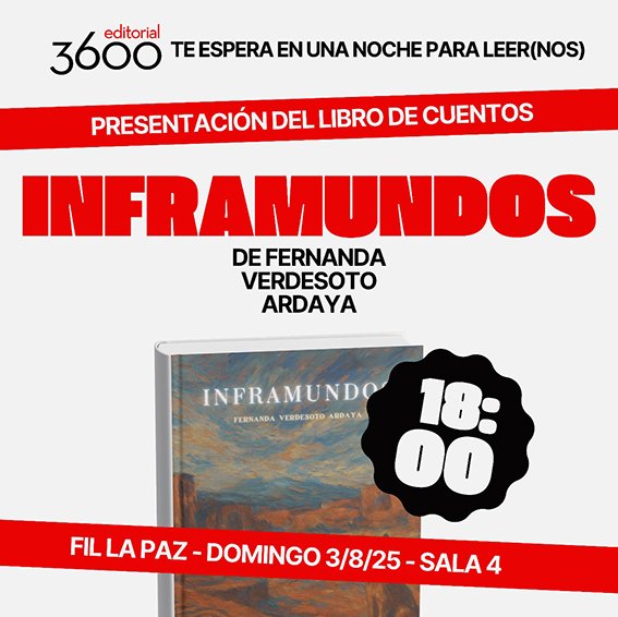 La Paz, julio de 2025. Este domingo 3 de agosto a las 18:00 en la Sala 4 de la Feria Internacional del Libro de La Paz (FIL La Paz 2025), la escritora y académica Fernanda Verdesoto Ardaya presentará su nuevo libro de cuentos, titulado Inframundos, bajo el sello de Editorial 3600. La publicación propone una lectura radical y sensible sobre lo que habita bajo la superficie: objetos, memorias, huellas y silencios que se niegan a desaparecer.