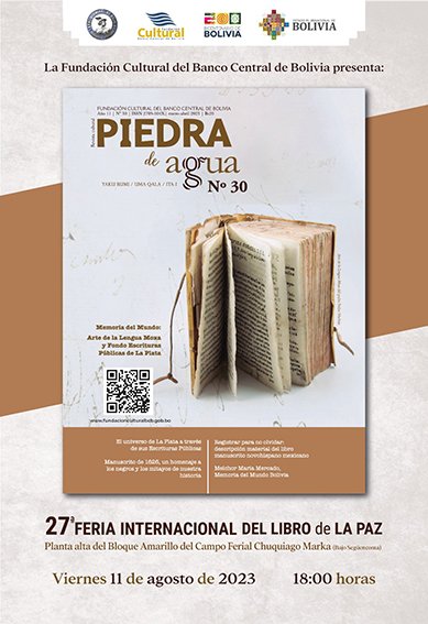 La Feria Internacional del Libro de La Paz será el escenario para la presentación de la revista cultural académica Piedra de Agua n° 30. La actividad se desarrollará el viernes 11 de agosto en la Sala Urtika, planta alta, bloque amarillo del campo ferial Chuquiago Marka, a las 18:00. En esta edición, la publicación está enfocada a la difusión de documentos históricos que fueron incluidos al programa Memoria del Mundo (MoWLAC) que impulsa la Organización de las Naciones Unidas, para la Educación, la Ciencia y la Cultura (Unesco).